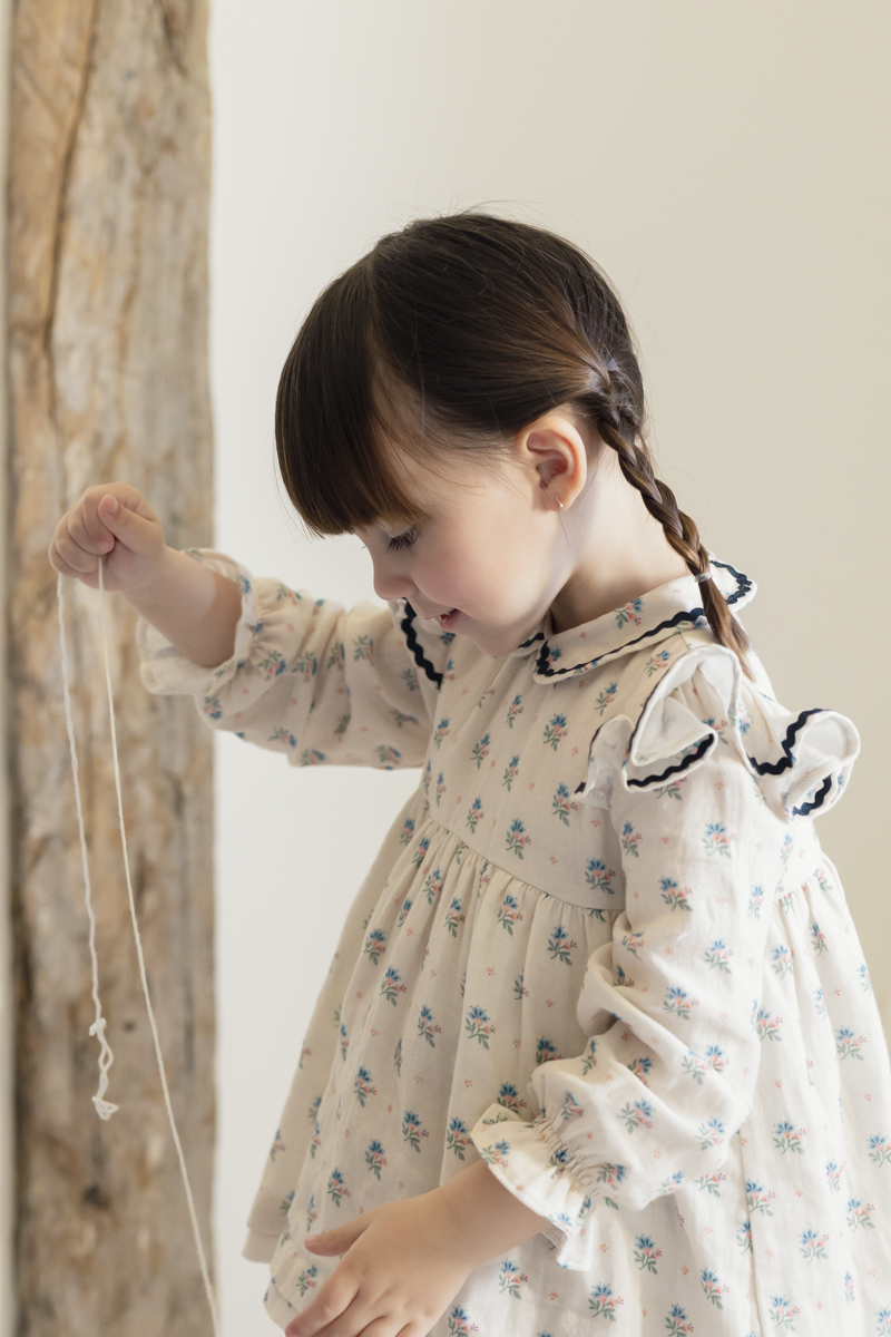 LojaVestido Pregas Gaze Flor Azul e Rosa